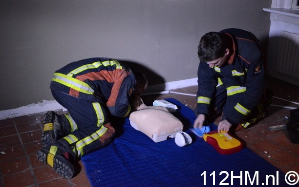 In een woning naast het brandende huis oefende de brandweer het reanimeren van personen met behulp van enkele oefenpoppen.