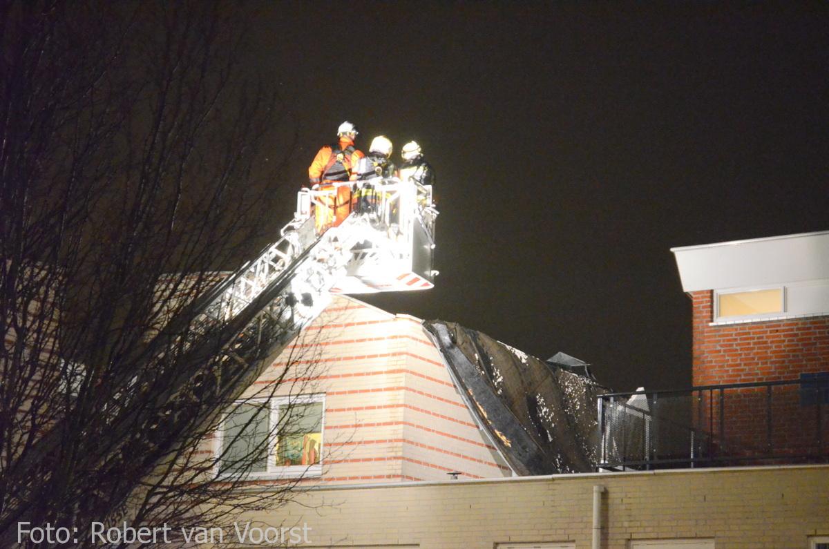 Ter plaatse bleek dat er diverse delen van het platte dak van een woning los waren geraakt door de harde wind. Enkele dakdelen waren weg geblazen en een groot gedeelte van het dakleer hing aan de zijkant van de woningen. De brandweer is enige tijd met behulp van de ladderwagen bezig geweest om de situatie weer enigszins veilig te maken en verdere schade te voorkomen. Hoe groot de exacte schade is en of er wellicht ook hierdoor waterlekkage is opgetreden is niet duidelijk.