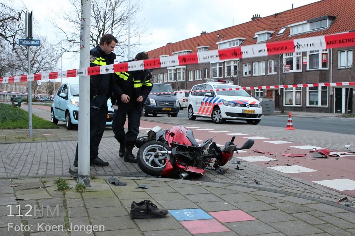 Het ongeval vond plaats op de Sumatrastraat met de Timorstraat in Leiden. De bestuurder van de scooter, waar tevens ook geen kentekenplaat op zat is na het ongeval, op bloten voeten weggerend, maar niet snel daarna aangehouden door toegesnelde agenten welke naar de bestuurder op zoek waren. Het is onbekend of de scooter bijv. is gestolen. Hoe het ongeval precies heeft kunnen plaatsvinden is onbekend. De verkeersdienst van de politie komt ter plaatse om onderzoek te doen naar de exacte toedracht van het ongeval. Het voertuig wat bij het ongeval betrokken was, raakte door de aanrijding aan één kant beschadigd. De scooter daarin tegen raakte zwaarbeschadigd.