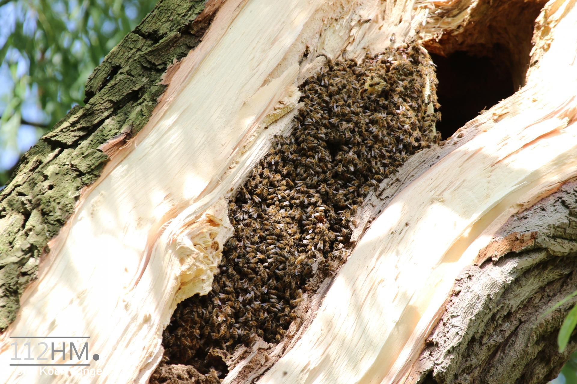 Ter plaatse bleek dat er in een grote afgebroken tak een behoorlijk bijennest te zitten. Een imker is ter plaatse gekomen en wilde het volk door middel van de autoladder van de brandweer verwijderen. Volgens de imker kon het bijennest, wat volgens hem een verwilderd volk was, niet op zo’n open plek leven. Hij vertelde dat de kern van het nest 36 graden moet zijn en dat het volk het niet gaat overleven als het slechter weer word.