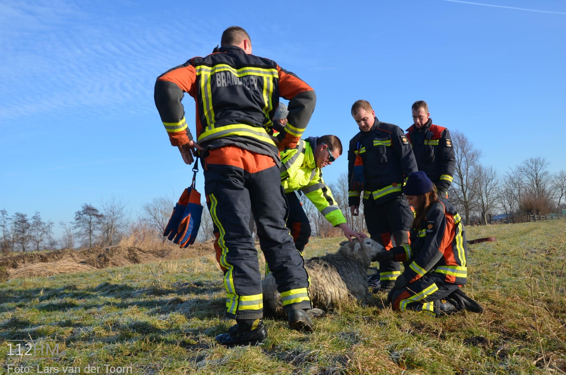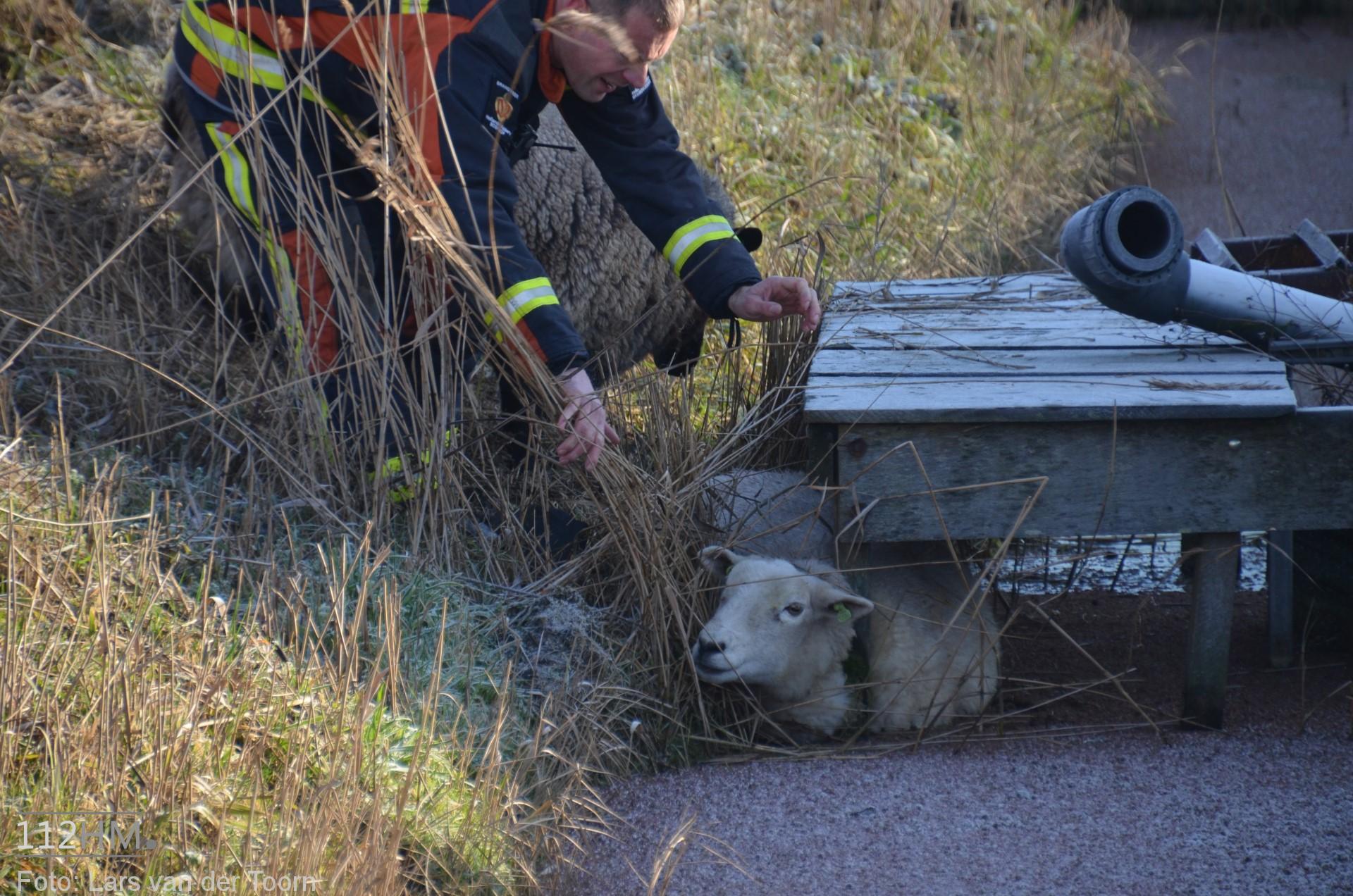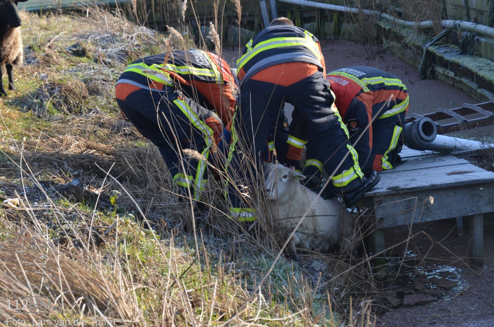 Boskoopse brandweer red twee schapen uit water langs voetpad aan de Goudse Rijweg Boskoop