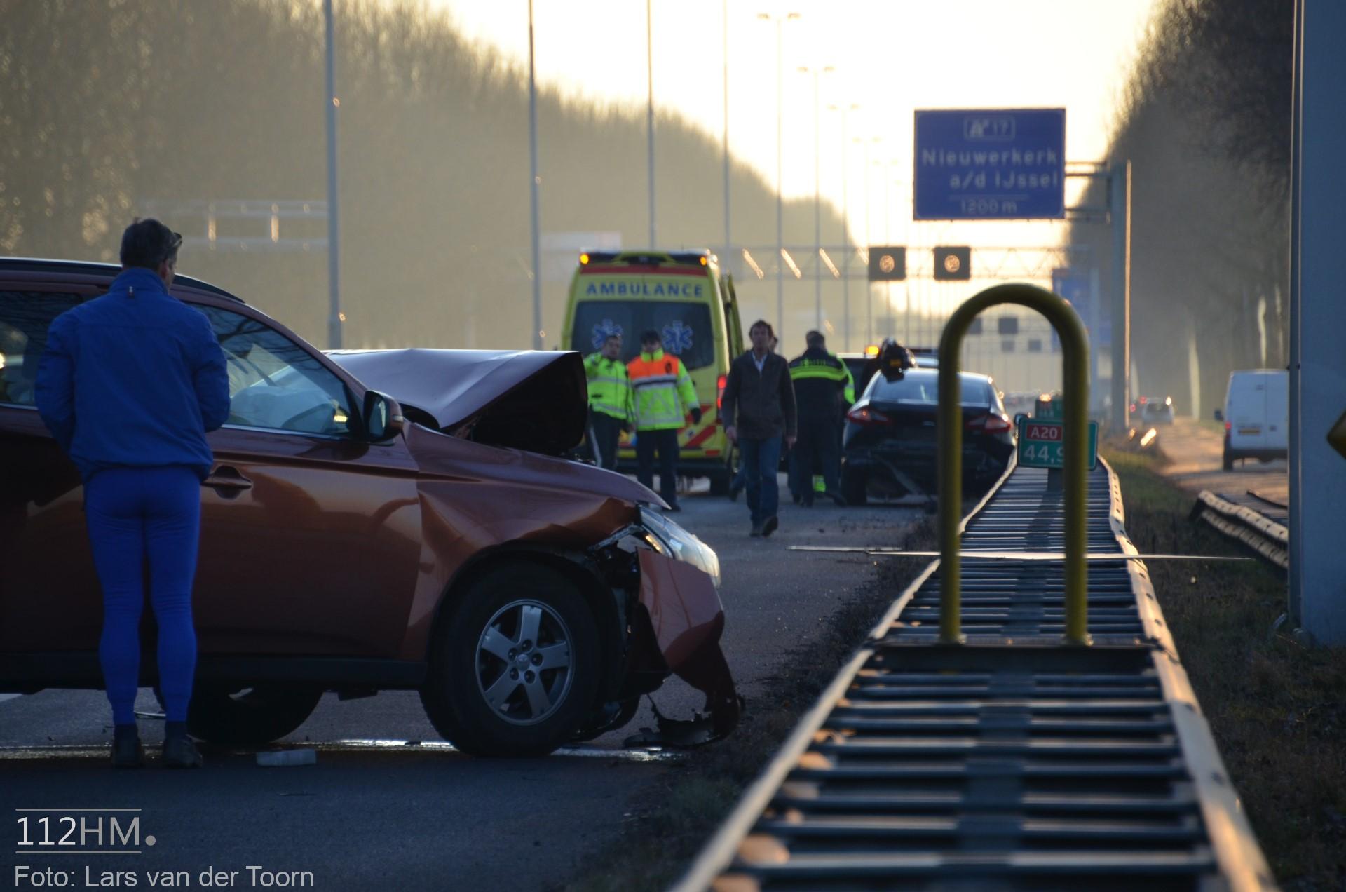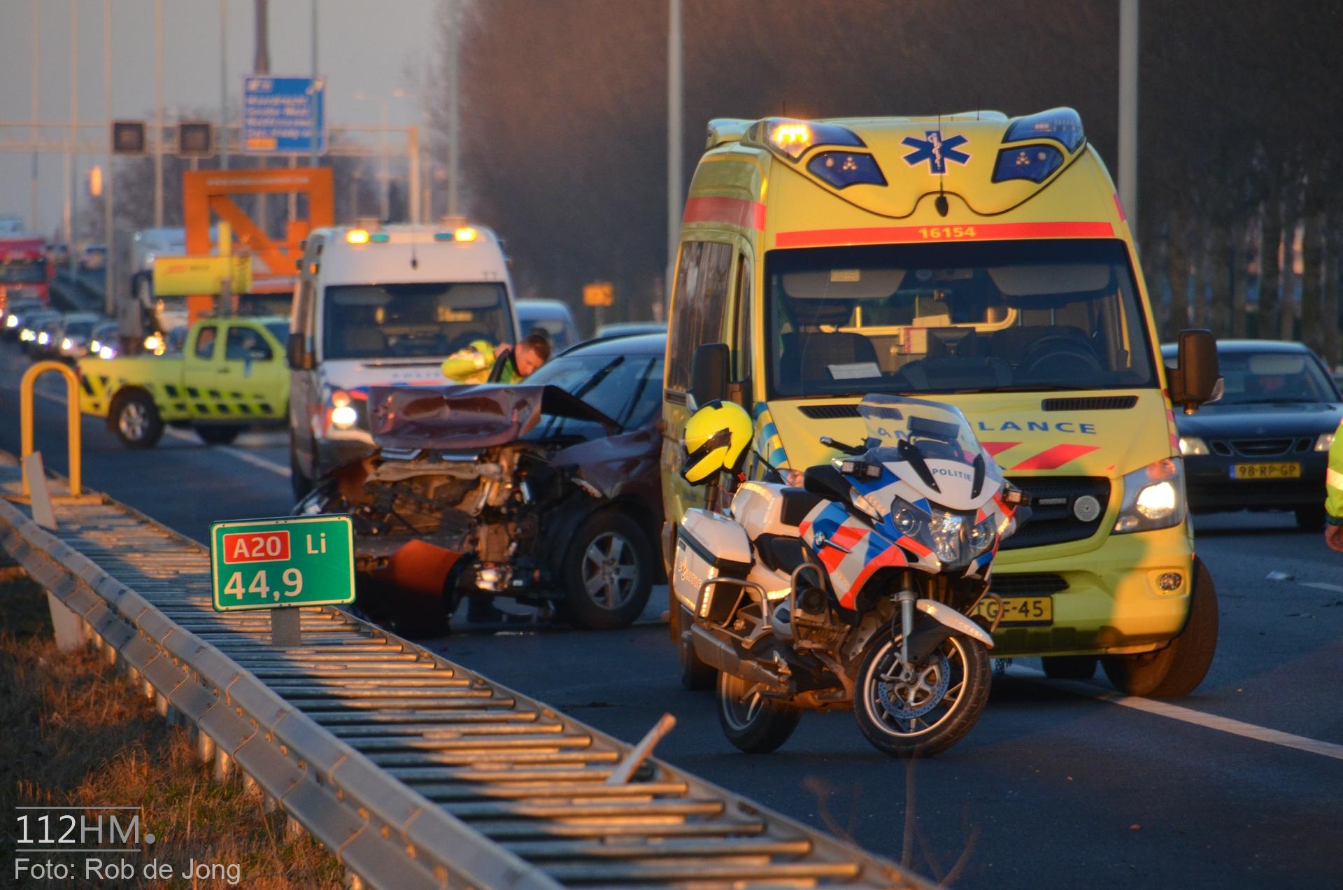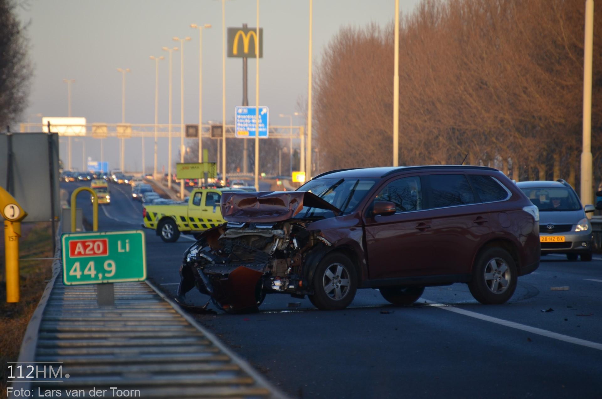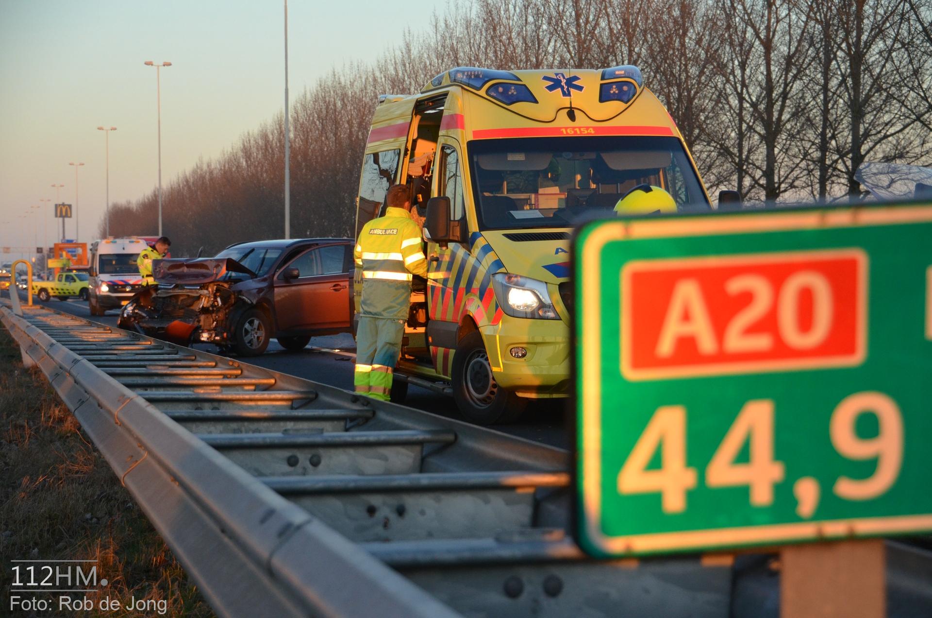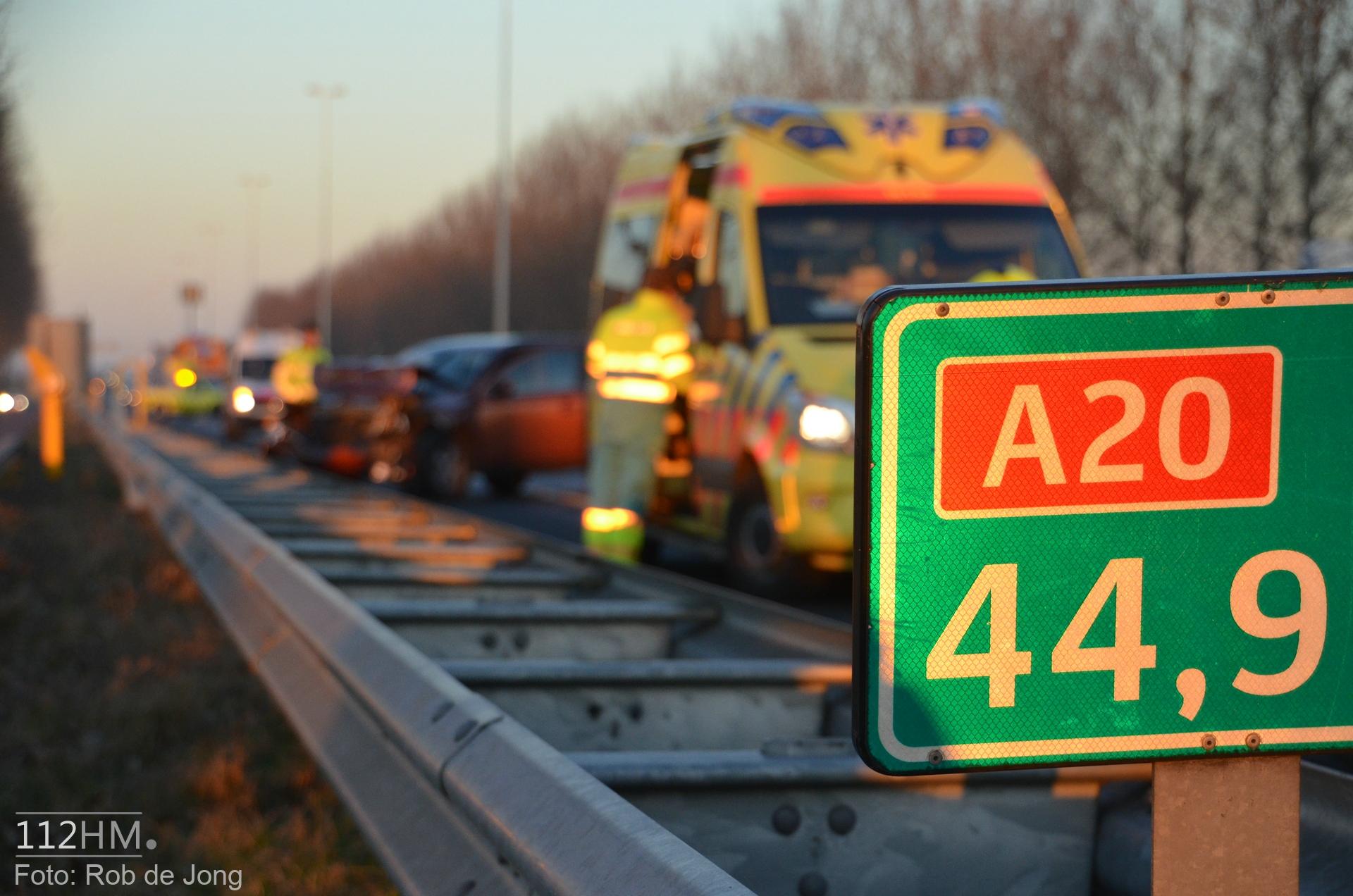 Ter plaatse op de A20 bleek er een flinke aanrijding te hebben plaatsgevonden tussen twee voertuigen. Hulpdiensten kwamen met spoed ter plaatse. De brandweer werd gealarmeerd omdat de bijrijder van het voorste voertuig bekneld zou zitten. Na controle in de ambulance zijn er meerdere personen vervoerd naar het ziekenhuis.
