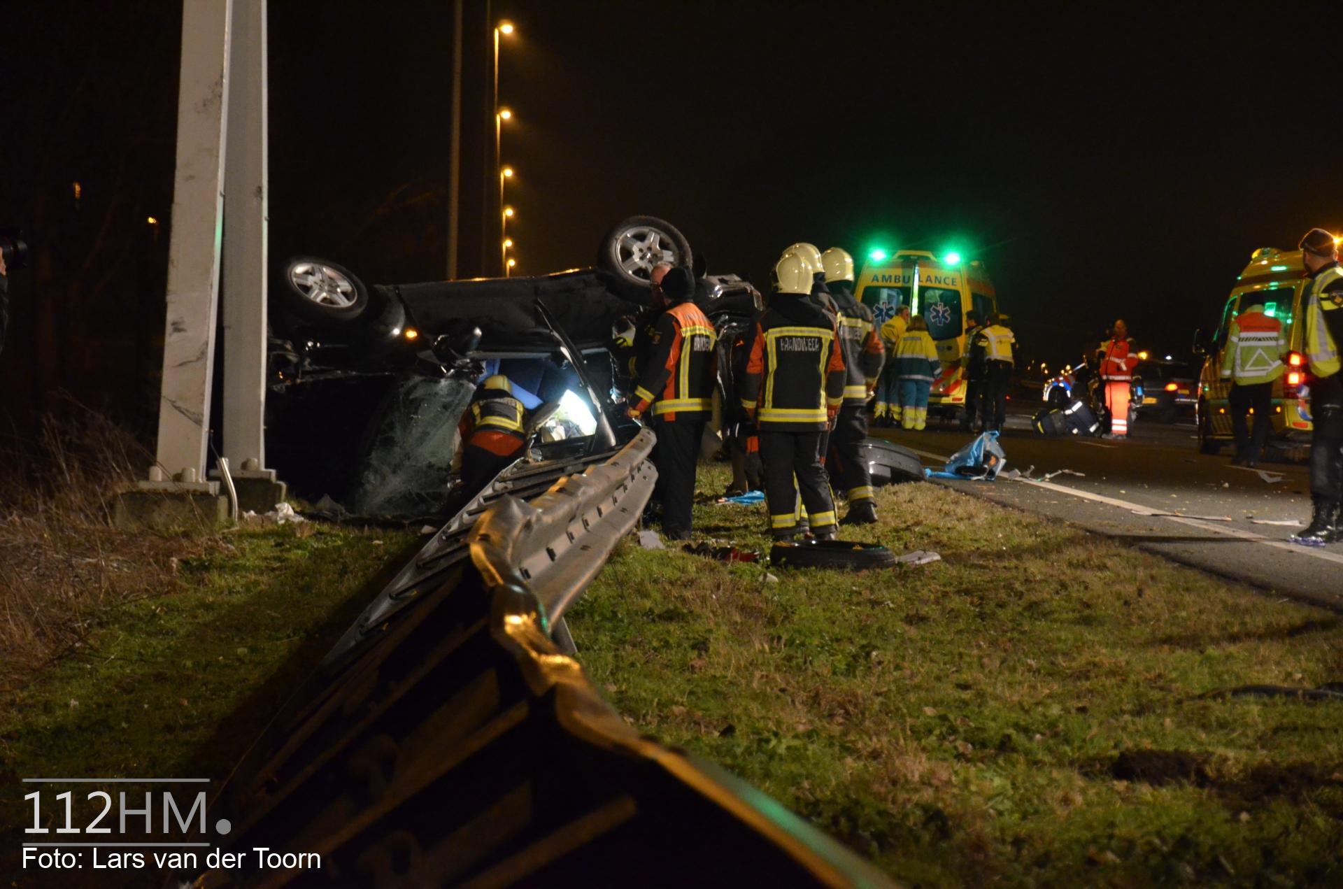Ter plaatse heeft er een flinke aanrijding plaatsgevonden waarbij één voertuig op zijn kop op de vangrail en tegen een portaal terecht is gekomen. De bestuurder raakte hierbij bekneld. De ter plaatse gekomen brandweer is direct begonnen om het slachtoffer zo snel mogelijk uit zijn benarde positie te bevrijden.