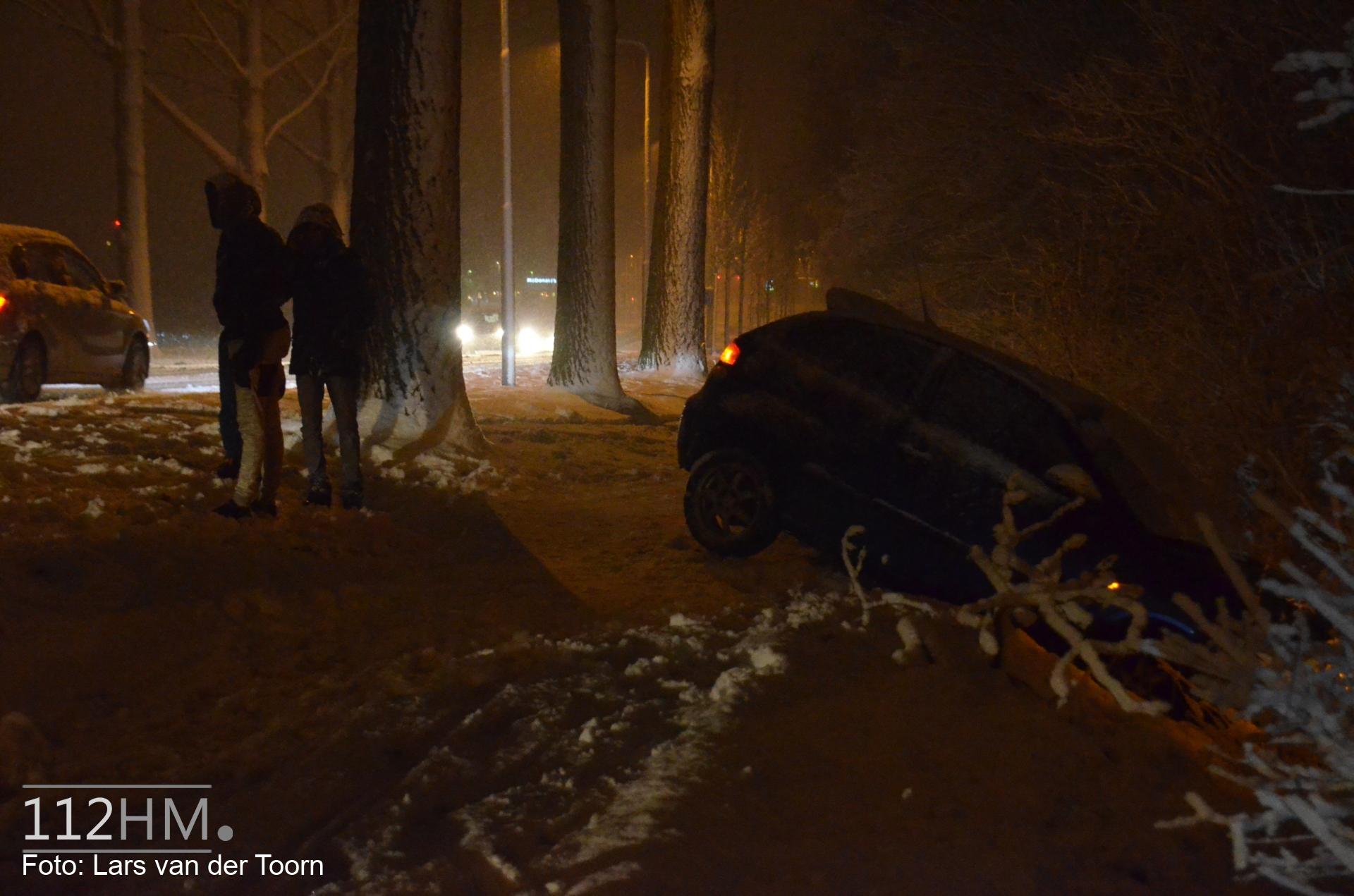Auto raakt door gladheid van de weg en belandt op de rand van talud op de Burgemeester Jamessingel in Gouda