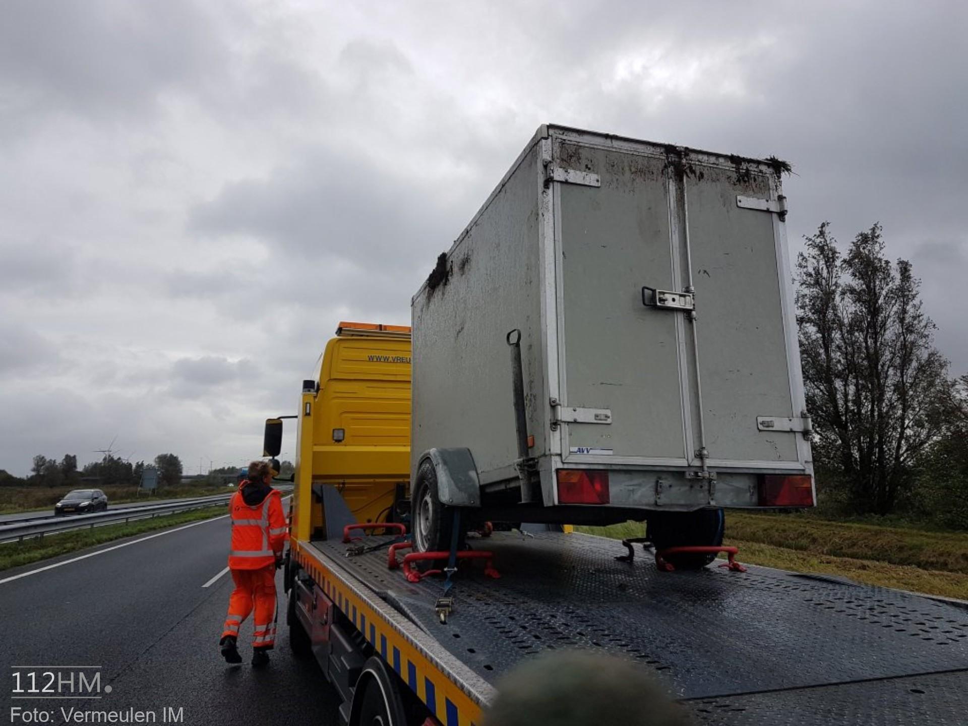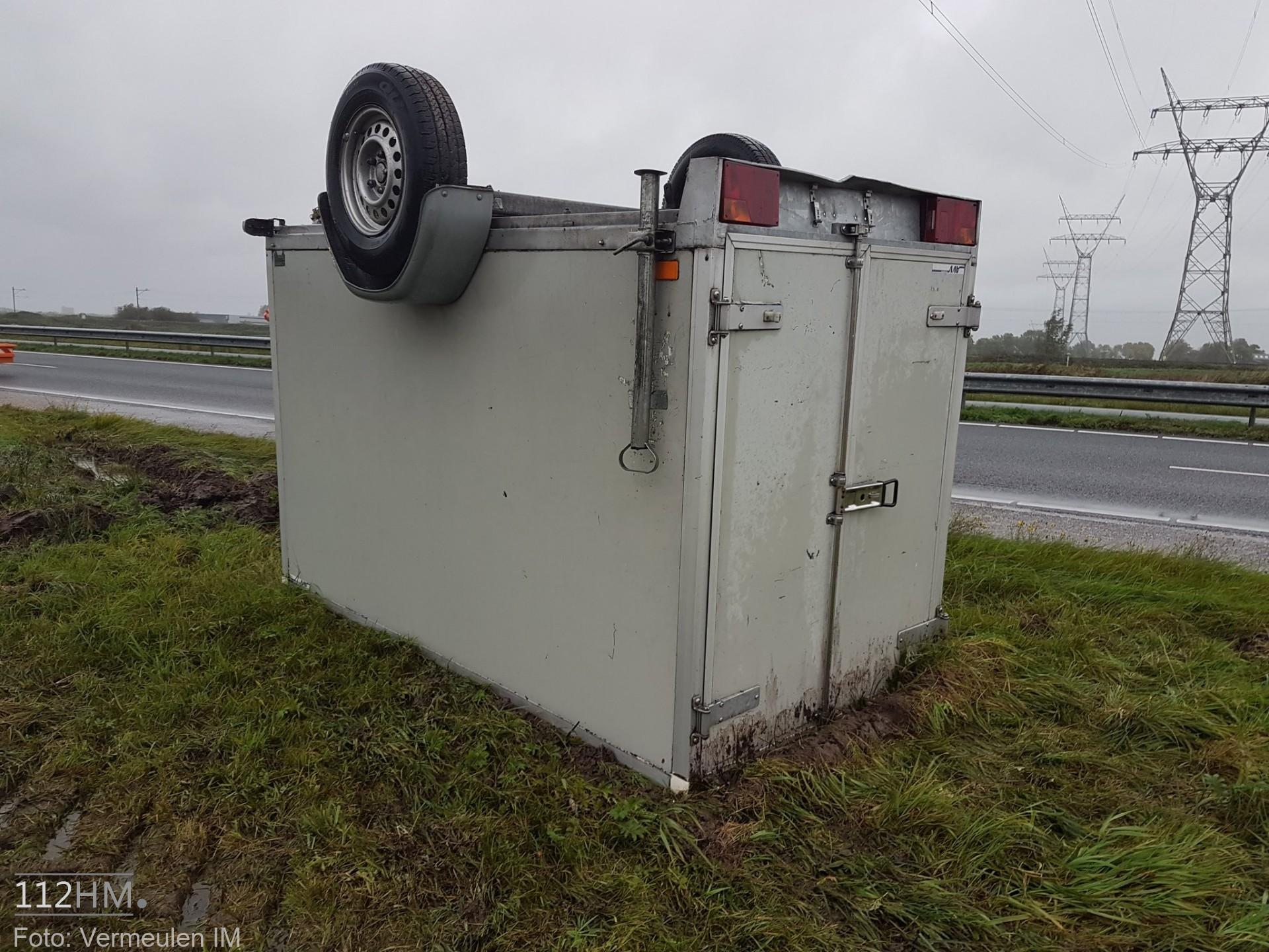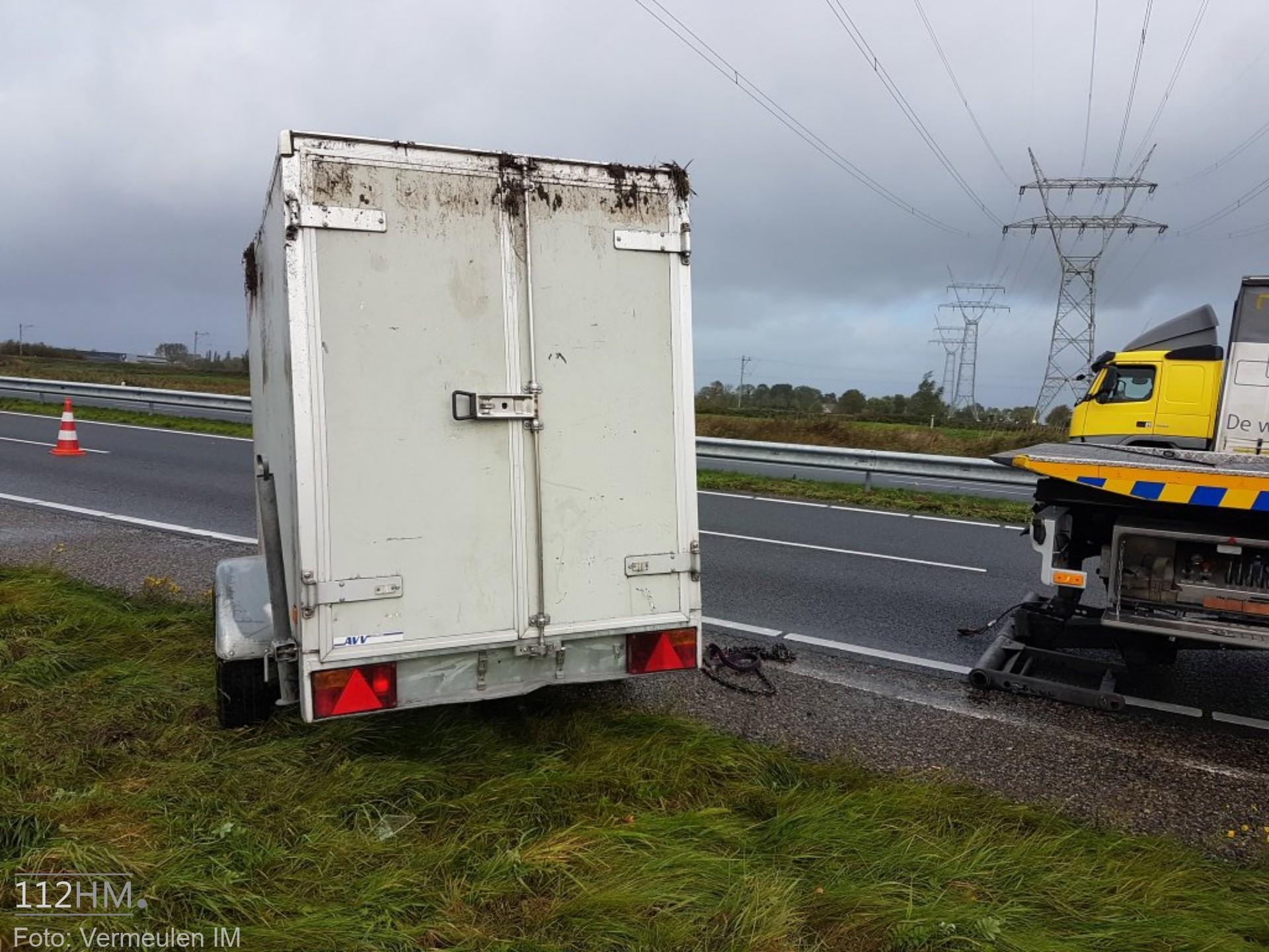 Of de aanhanger is weggewaaid is niet bekend. Het voertuig is na het verliezen van zijn aanhanger doorgereden en heeft zijn aanhanger op zijn kop achtergelaten in de berm. Later heeft de eigenaar zich bij de berger gemeld. Vermeulen IM heeft voor de berging van de aanhanger een rijstrook afgesloten. Een berger kwam ter plaatse en heeft de aanhanger meegenomen.