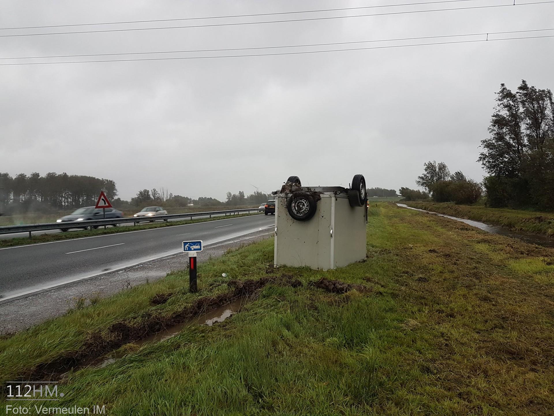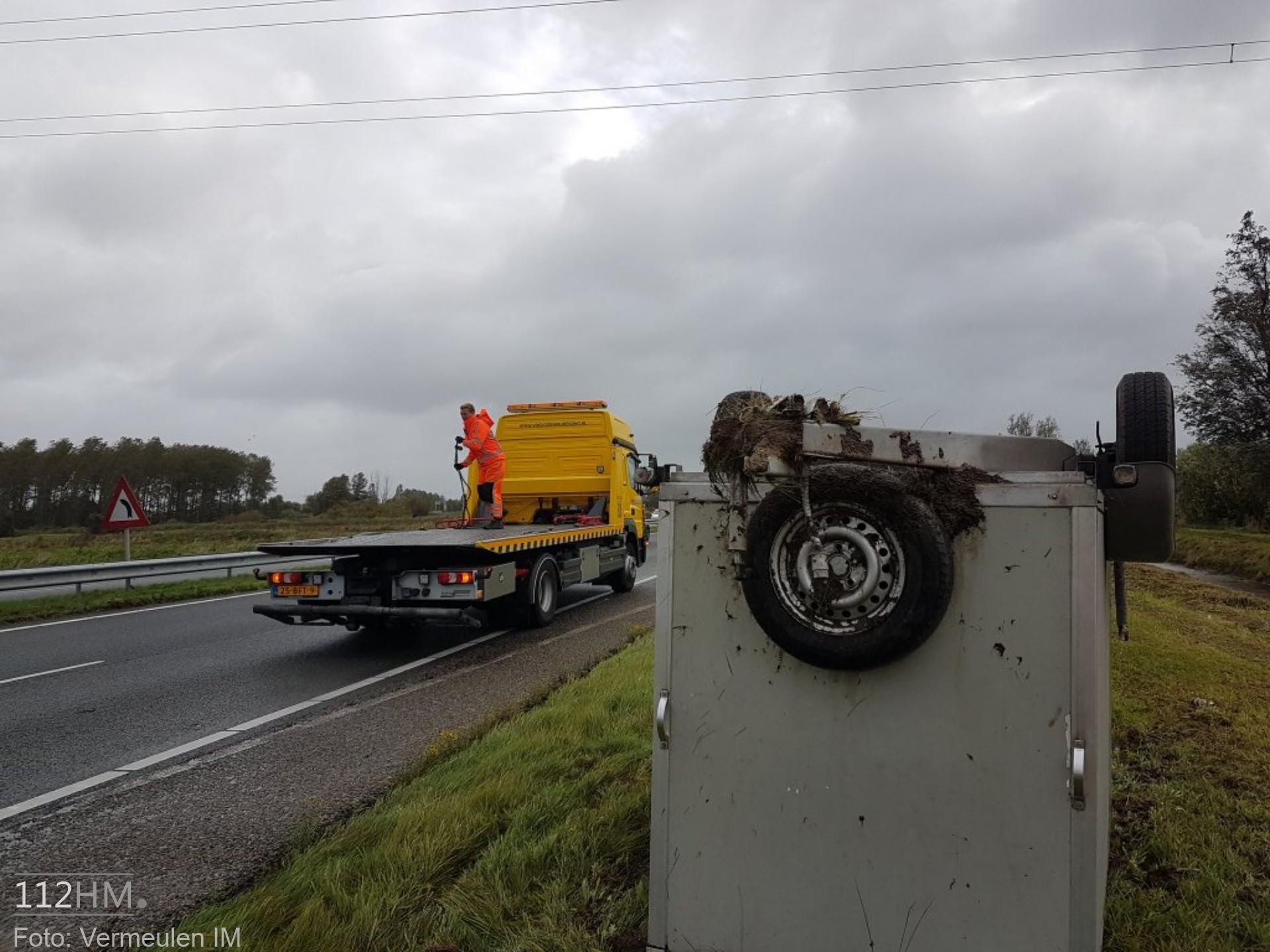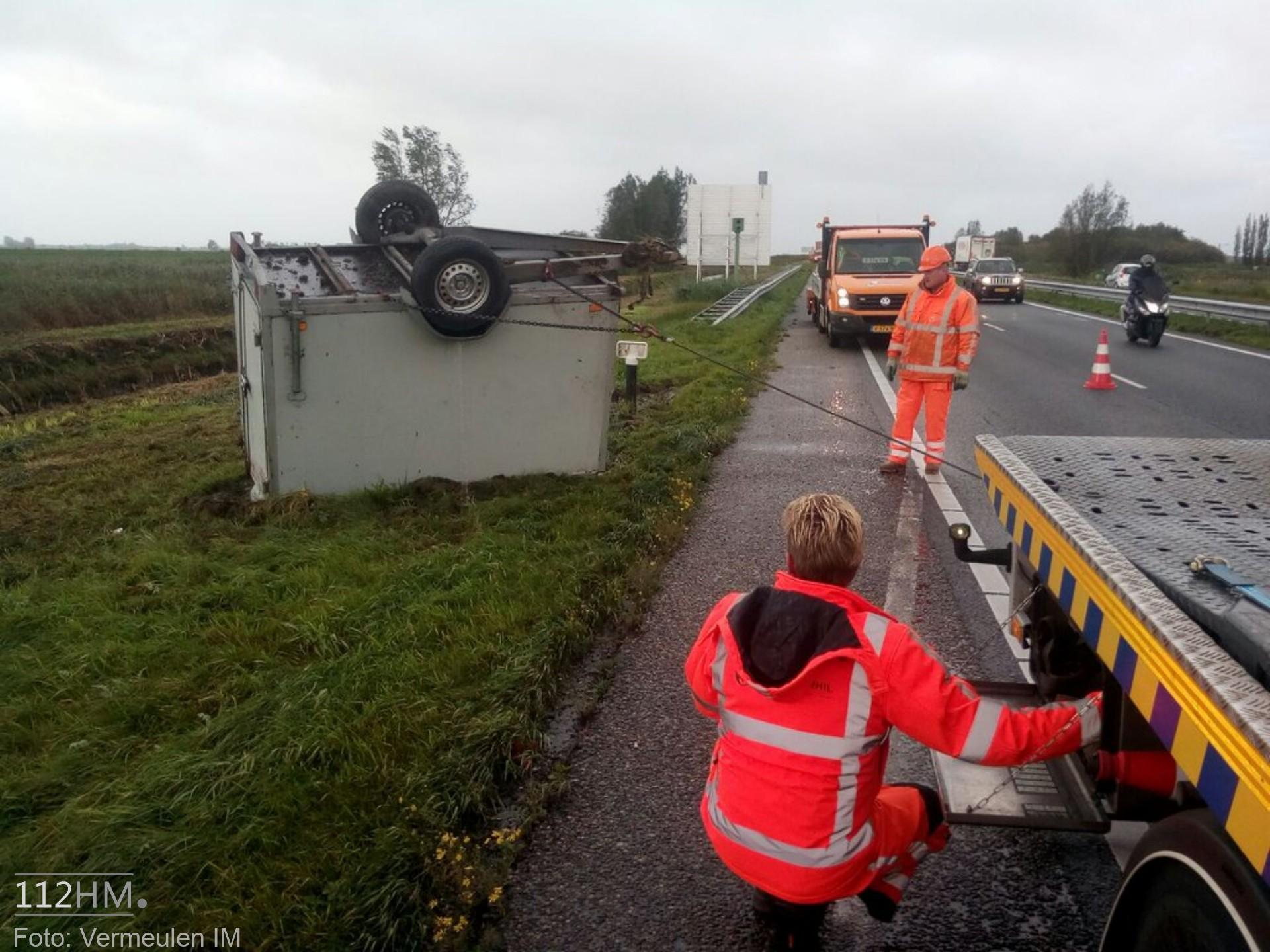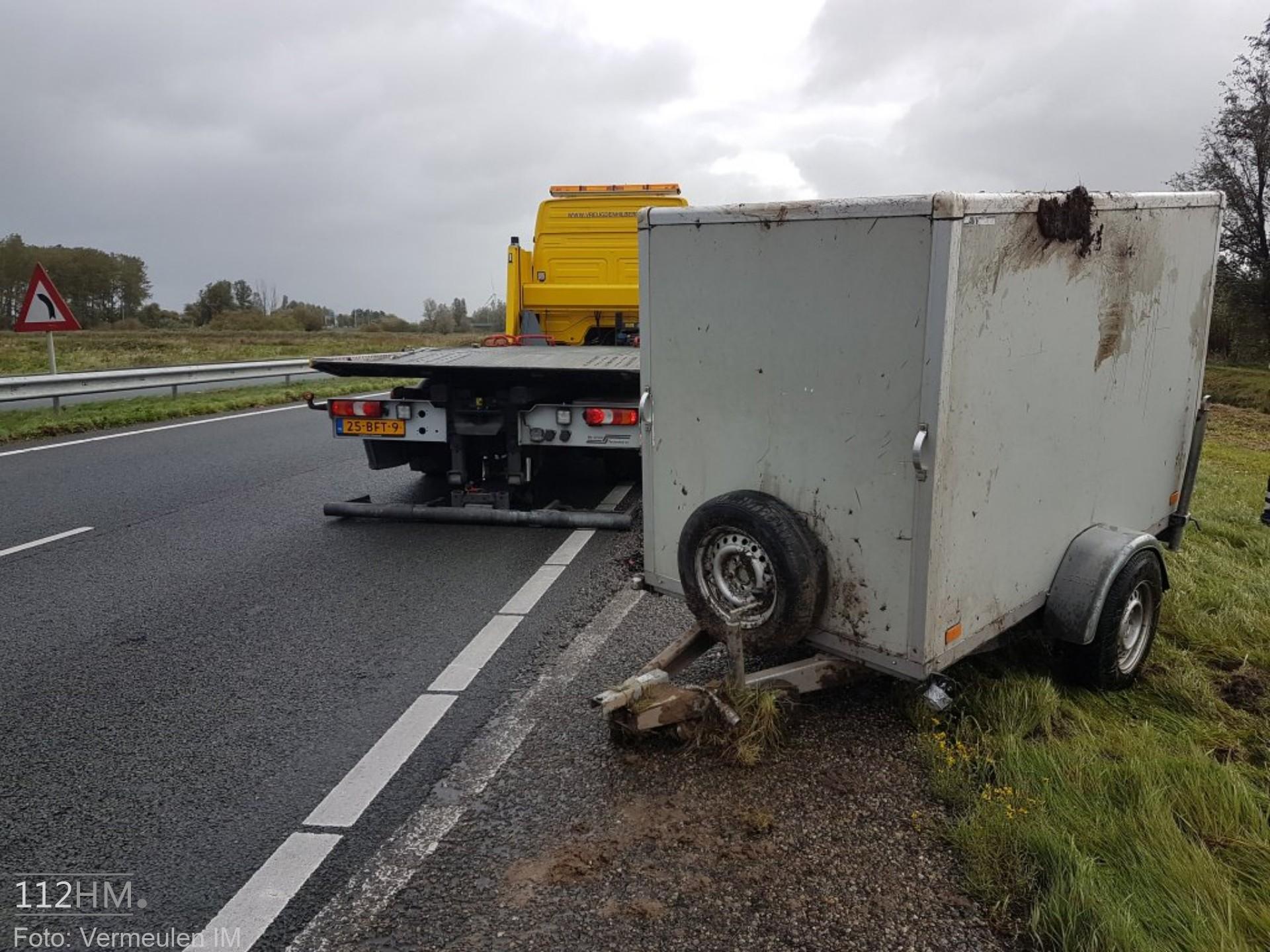 Of de aanhanger is weggewaaid is niet bekend. Het voertuig is na het verliezen van zijn aanhanger doorgereden en heeft zijn aanhanger op zijn kop achtergelaten in de berm. Later heeft de eigenaar zich bij de berger gemeld. Vermeulen IM heeft voor de berging van de aanhanger een rijstrook afgesloten. Een berger kwam ter plaatse en heeft de aanhanger meegenomen.