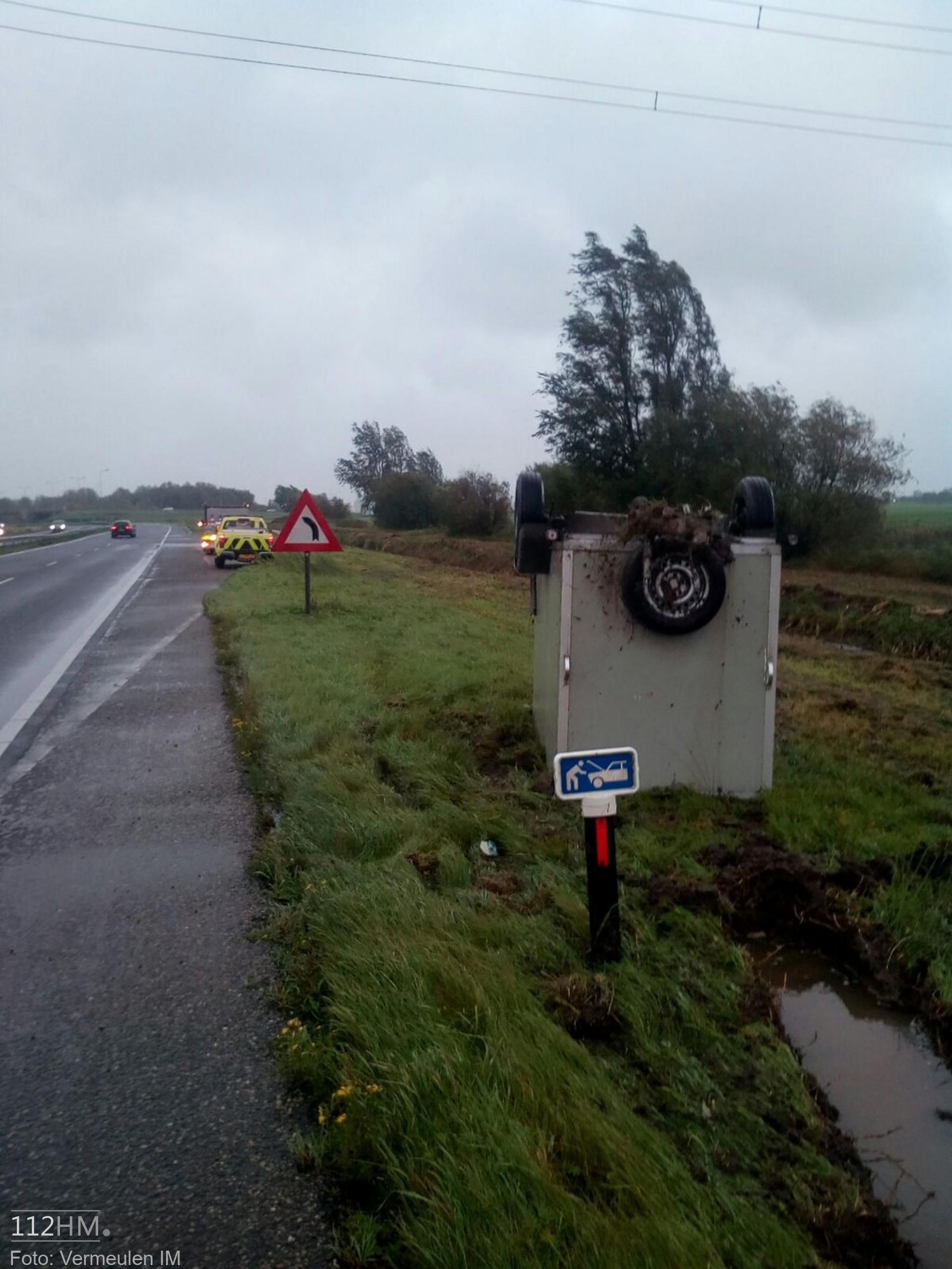 Auto verliest aanhanger en laat deze op zijn kop in de berm achter langs de N11 bij Hazerswoude