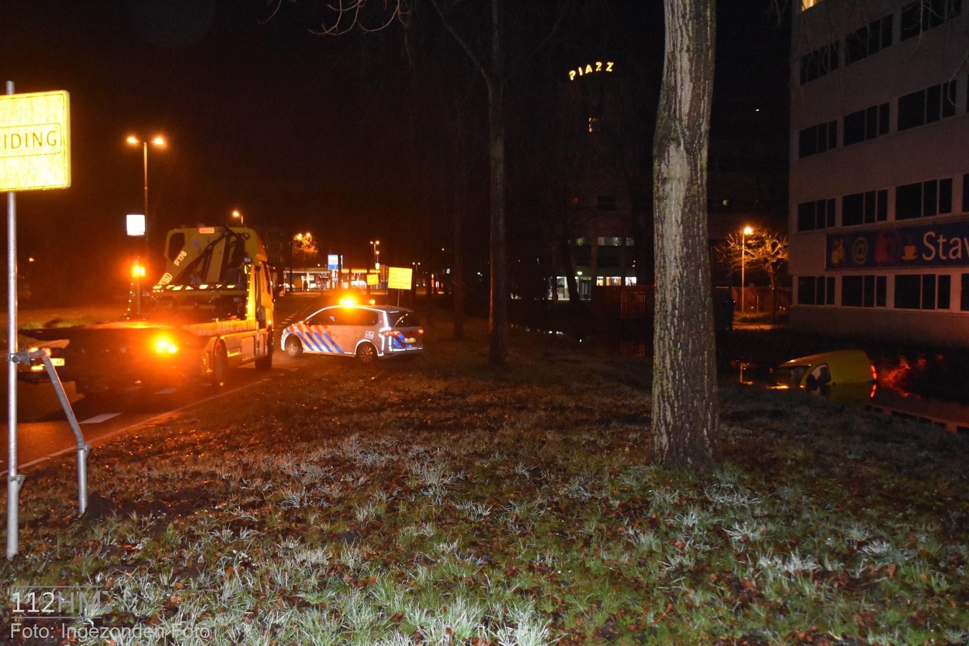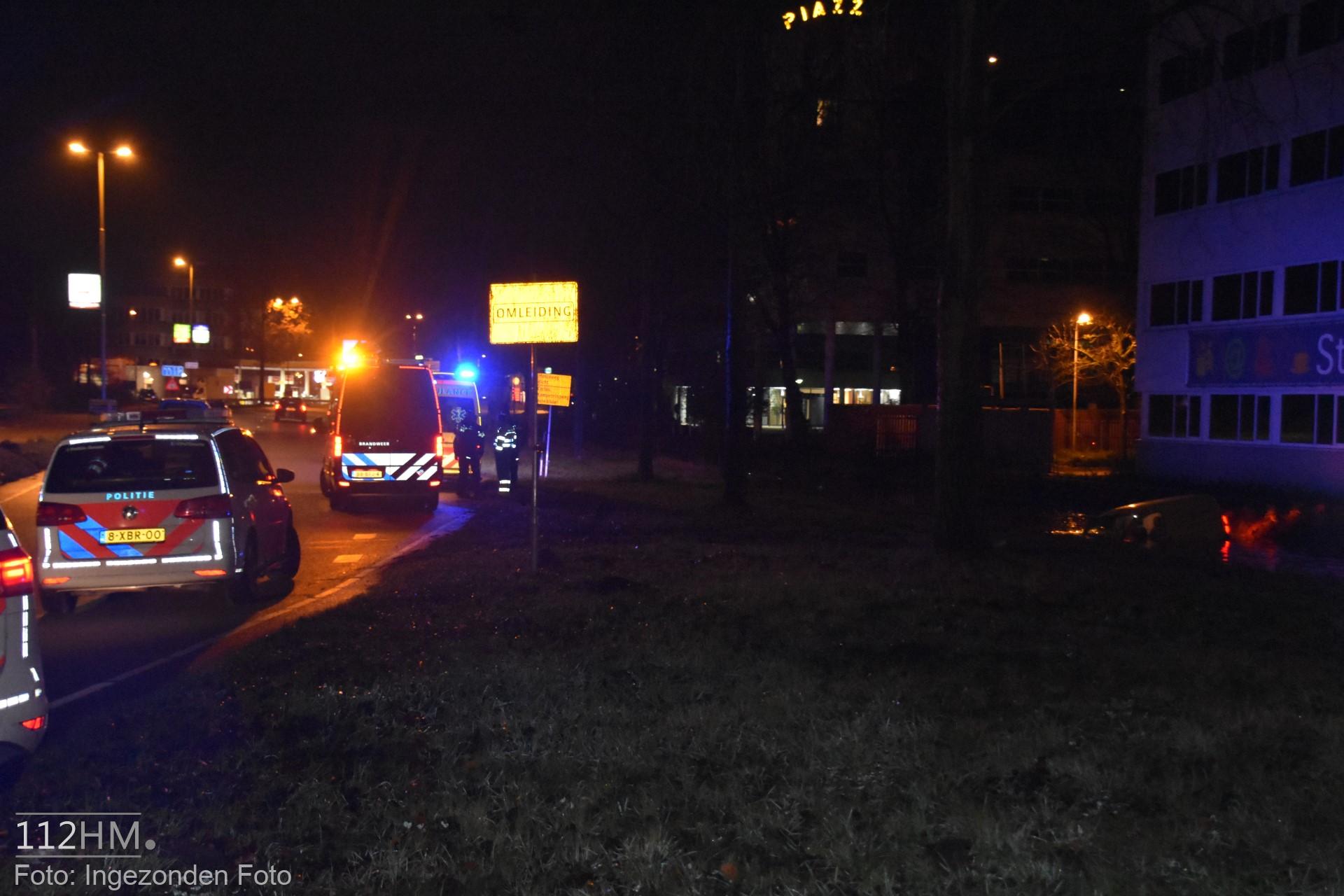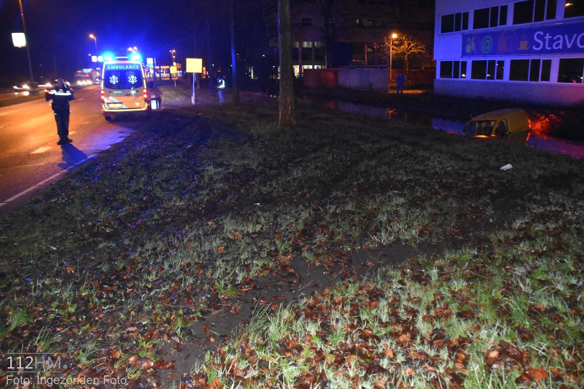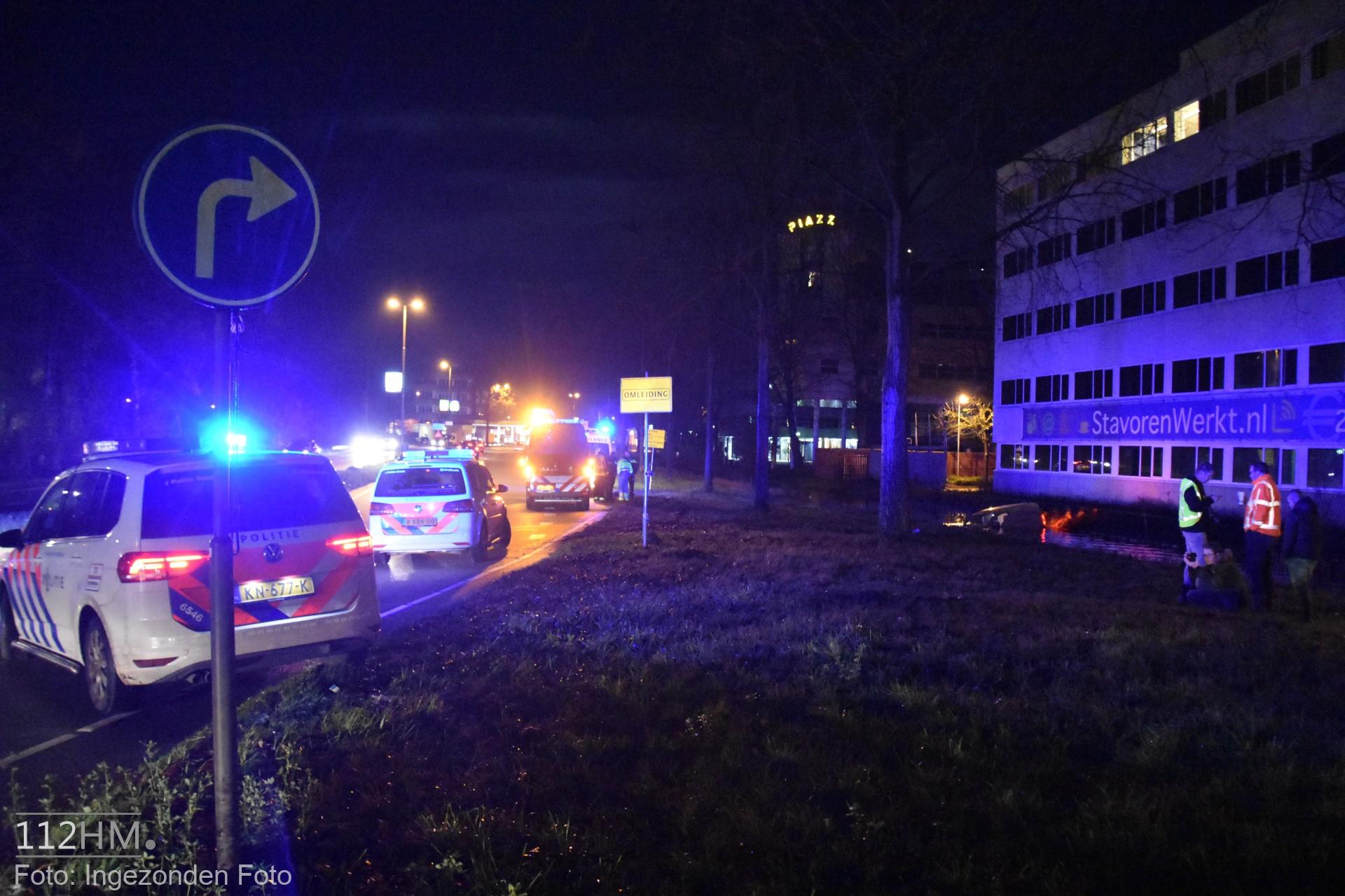 In de bocht van de Goudse Poort in de richting van de binnenstad bleek er een auto in de slip te zijn geraakt waardoor deze door de groenstrook is gegleden het water in. De bestuur kon zelfstandig en zonder verwondingen zijn voertuig verlaten.