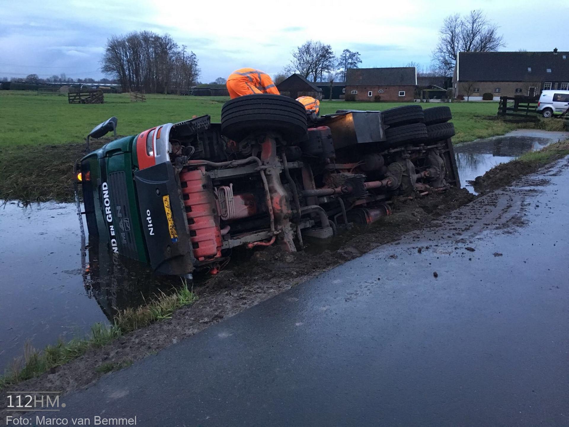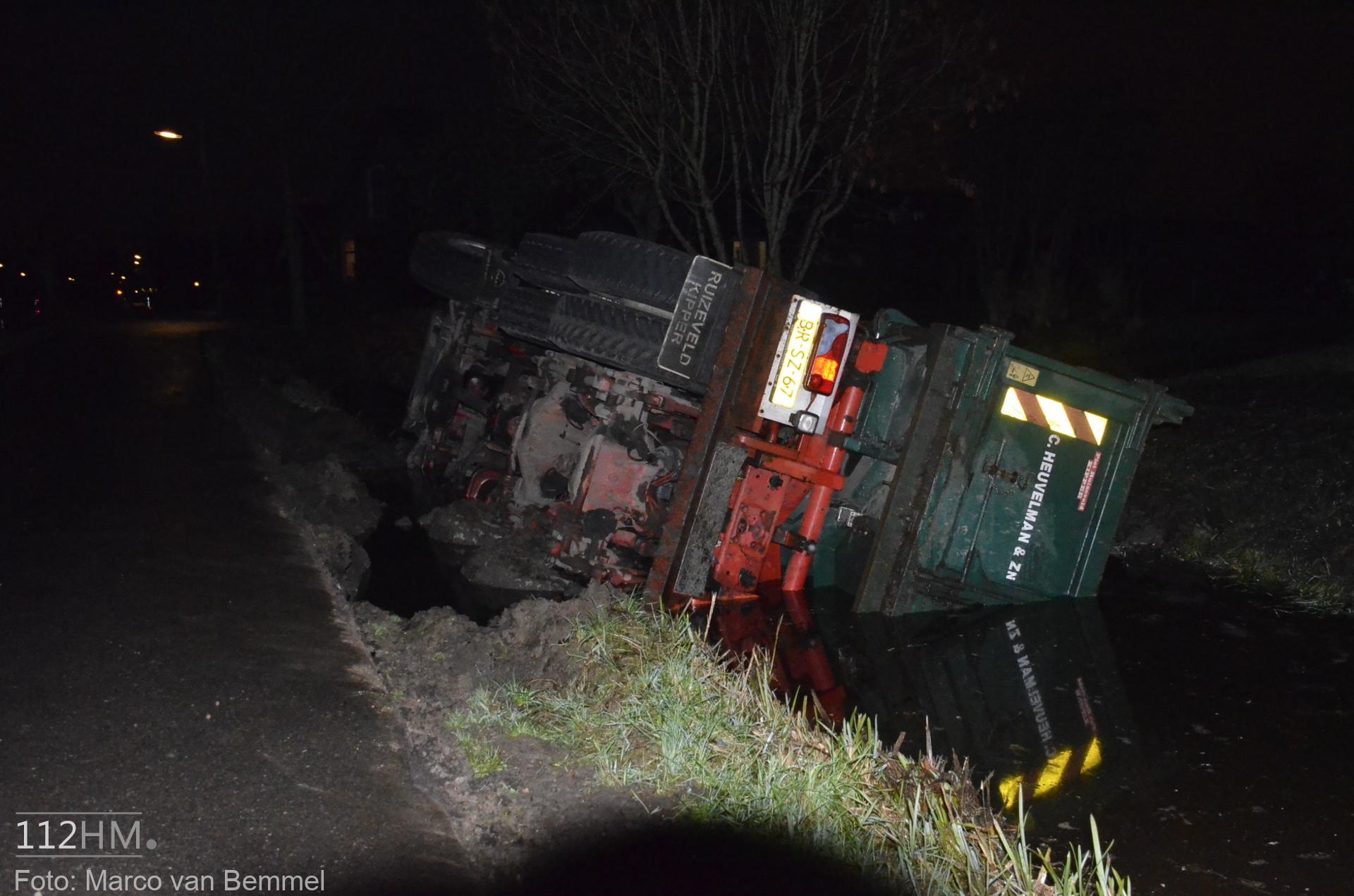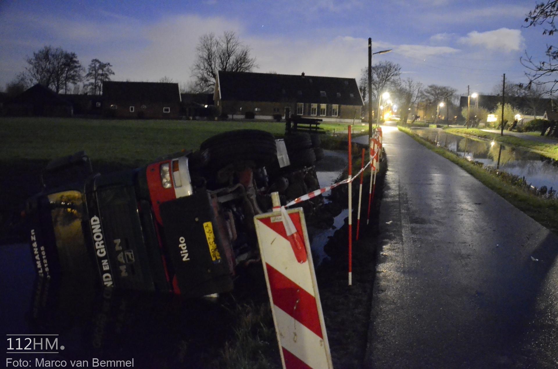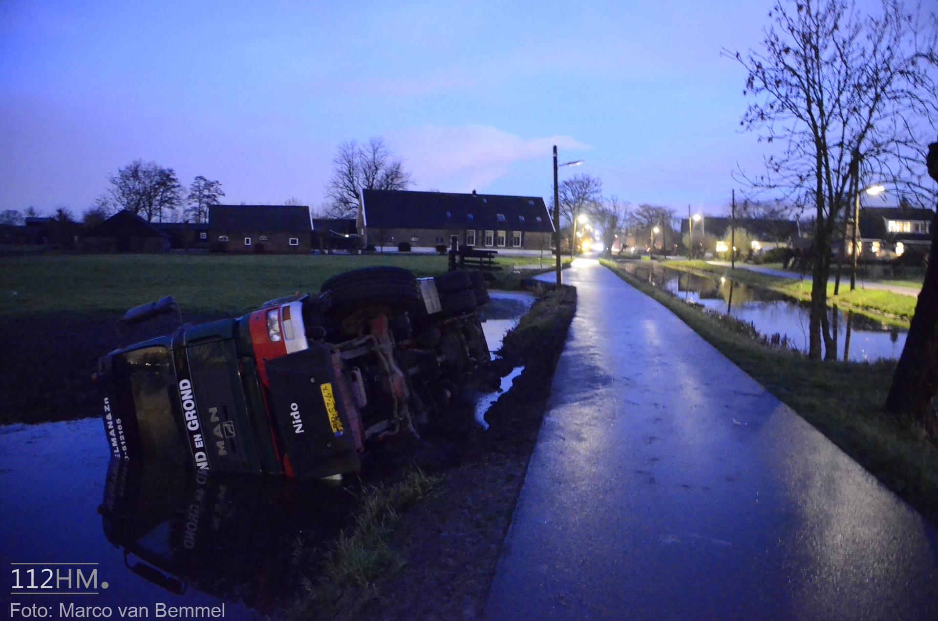 Een vrachtwagen bleek van de weg te zijn gekanteld waarna deze in de sloot terechtkwam. De chauffeur probeerde uit zijn cabine te klimmen maar het lukte niet. Omwonenden die het ongeval zagen gebeuren wisten met een ladder de cabine te bereiken en hielpen de chauffeur uit zijn benarde positie.