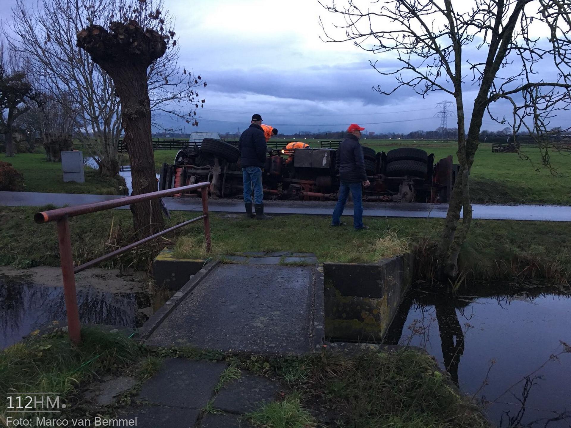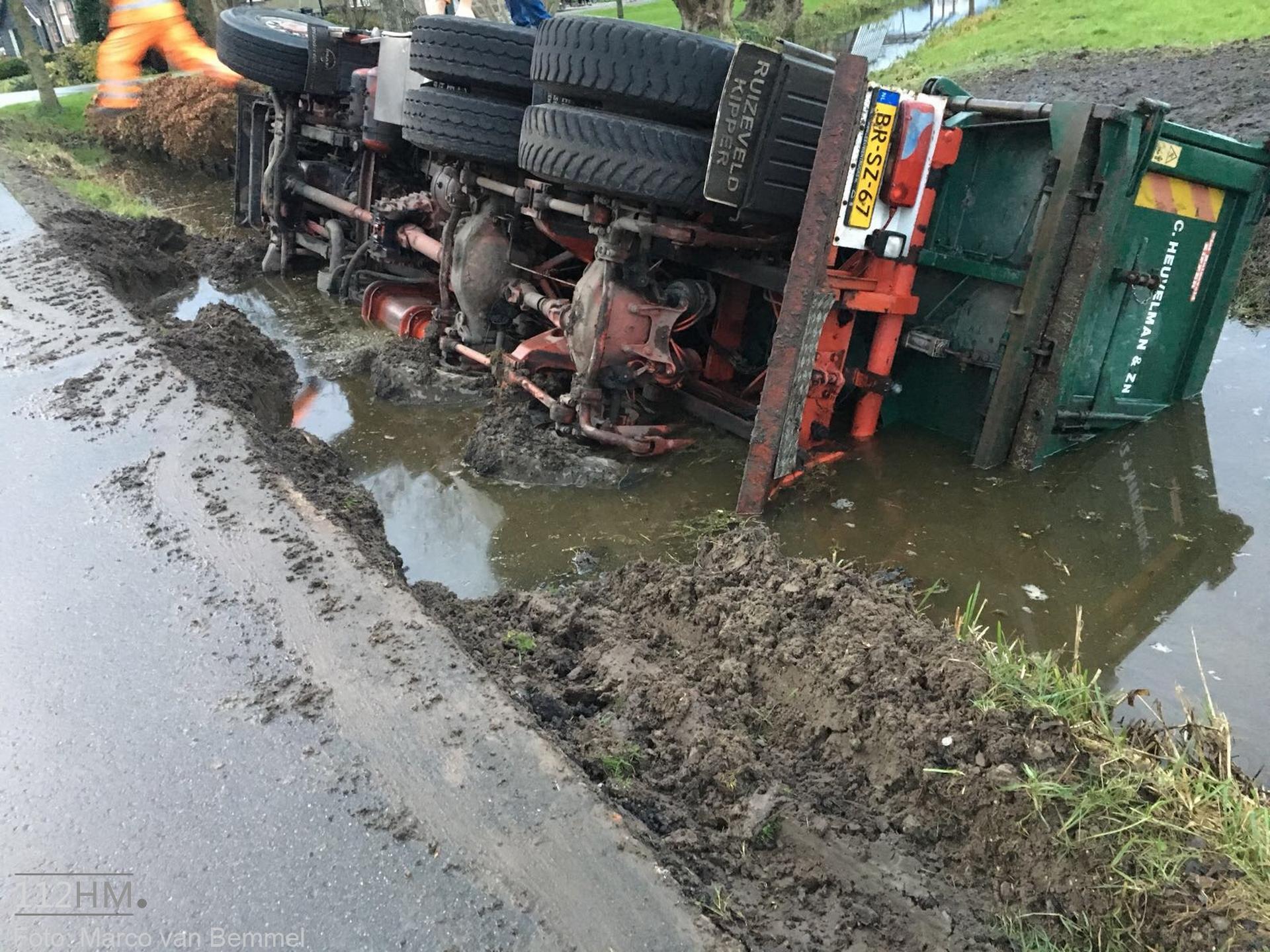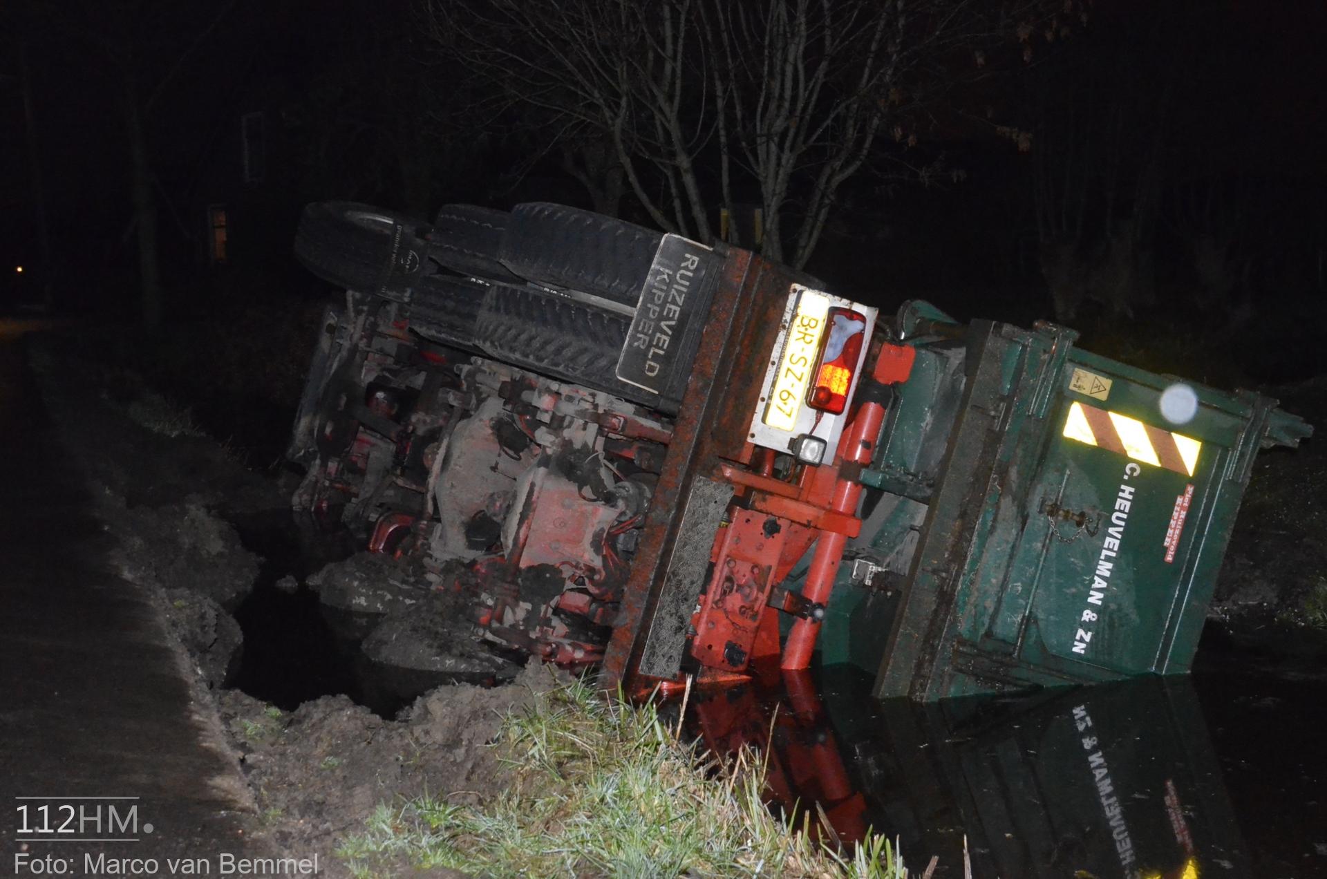 Een vrachtwagen bleek van de weg te zijn gekanteld waarna deze in de sloot terechtkwam. De chauffeur probeerde uit zijn cabine te klimmen maar het lukte niet. Omwonenden die het ongeval zagen gebeuren wisten met een ladder de cabine te bereiken en hielpen de chauffeur uit zijn benarde positie.