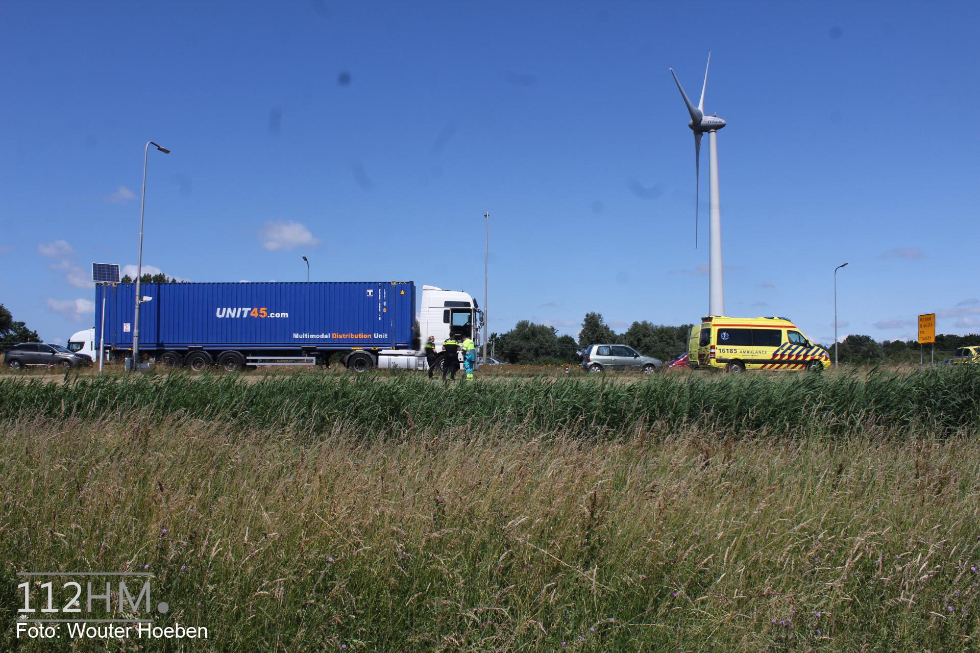 Door nog onbekende oorzaak is de vrachtwagen achter op de auto gereden waarbij de auto flinke schade heeft opgelopen. Ambulancepersoneel heeft de bestuurder van de auto ter plekke behandeld aan de verwondingen.