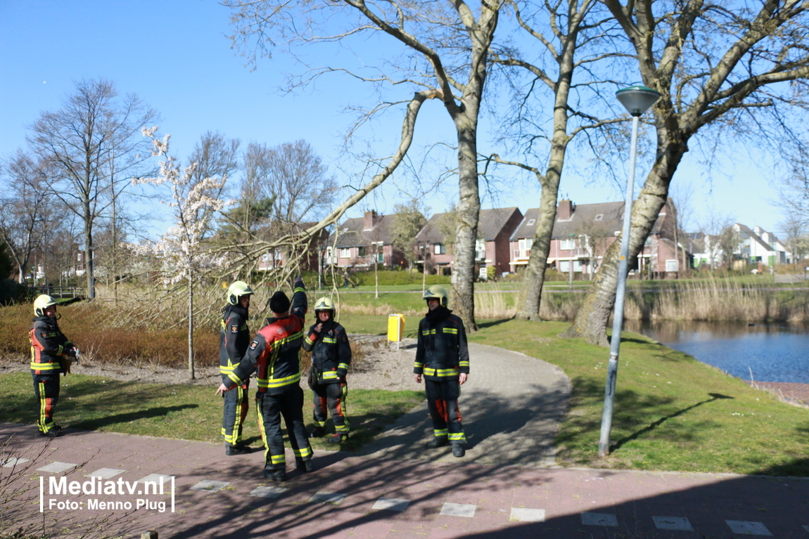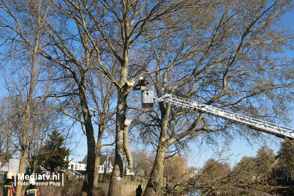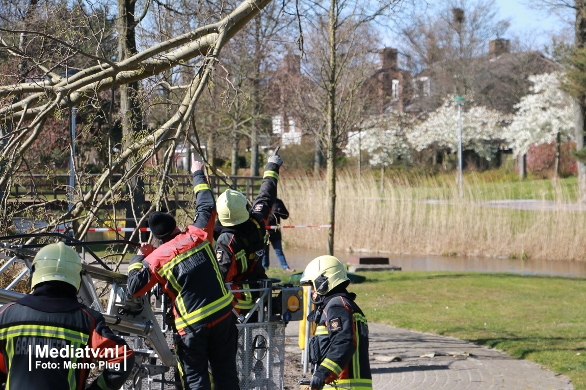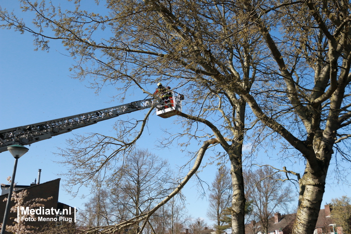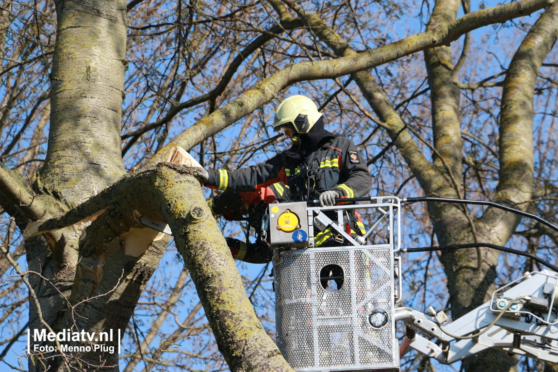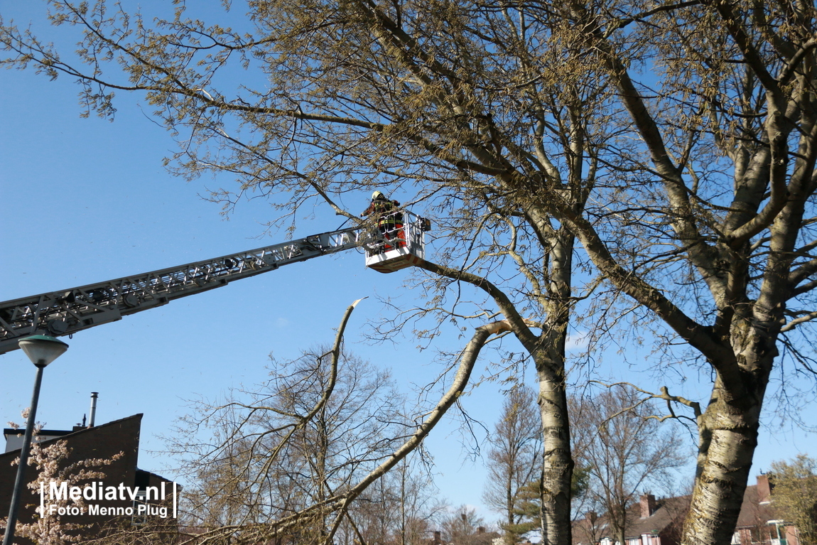 De brandweer heeft m.b.v. de autoladder de takken klein en afgezaagd en zodoende het mogelijke gevaar voor passanten weggehaald.
